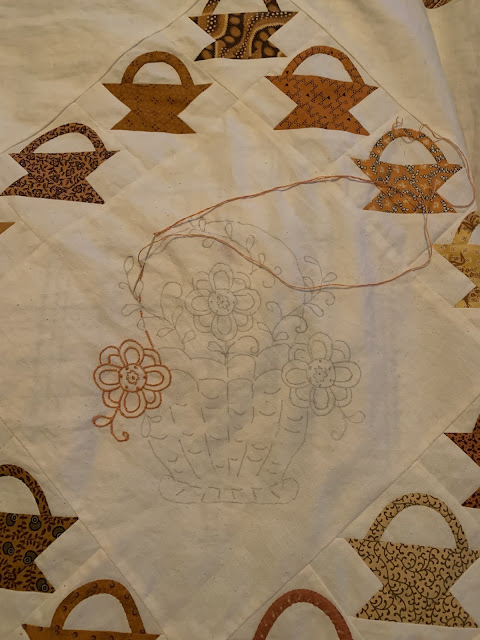 This is just stunning - Those cheddar baskets are amazing on their own but with the added embroidery - oh la la !! Then how will you quilt it? Hug your sister for us
